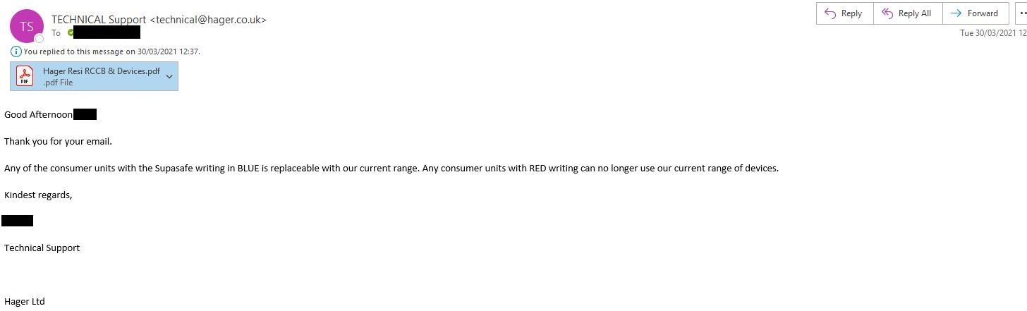 Consumer units with a blue Supersafe label can utilise Hager Parts- if the supersafe label is red or is not labelled supersafe then no replacement parts are available